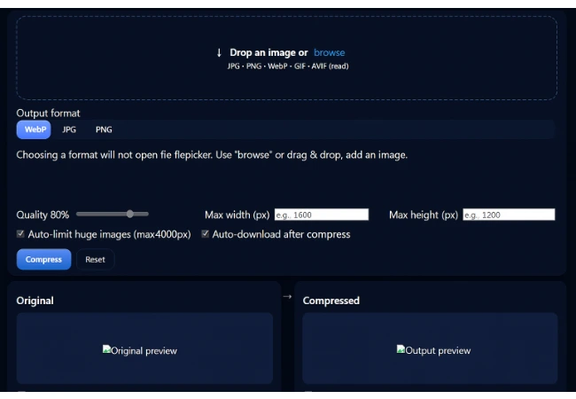 This is a free tool you can download and use directly in your browser. It helps reduce the size of large images quickly without uploading them online. Everything happens on your computer, so your privacy is safe.