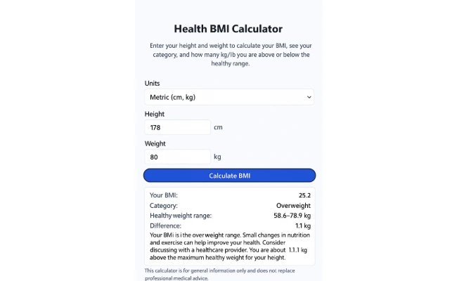 The Health BMI Calculator is a quick and simple tool for anyone who wants to understand their weight status better. Whether you use metric or imperial measurements, it gives you clear results, a healthy weight range, and practical guidance based on your BMI. It is useful for everyday health awareness and easy to use on any device.