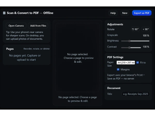 The Scan and Convert to PDF app lets you capture or upload documents and save them as a multipage PDF or as individual JPEG images. It works entirely offline, so no data is sent to a server.